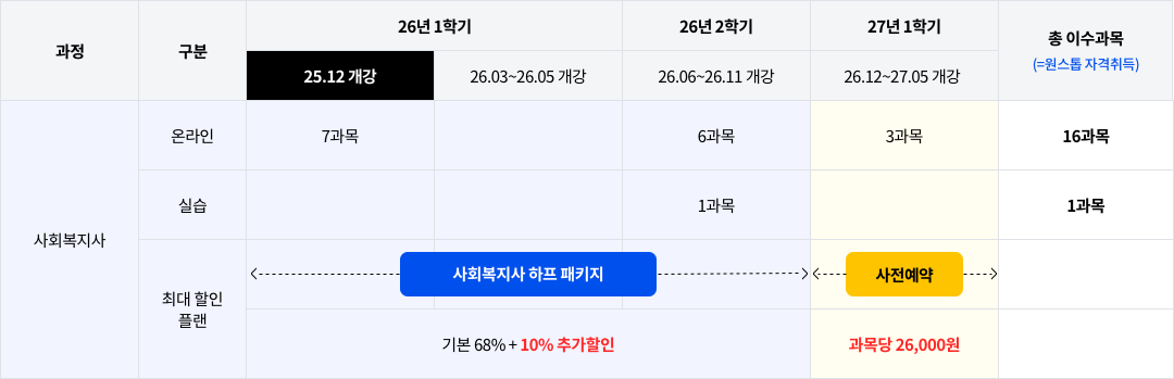 사회복지 전공 7과목(21학점) | 전공3+교양2과목(18학점) | ||