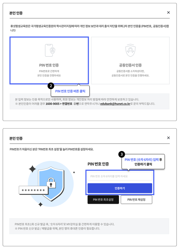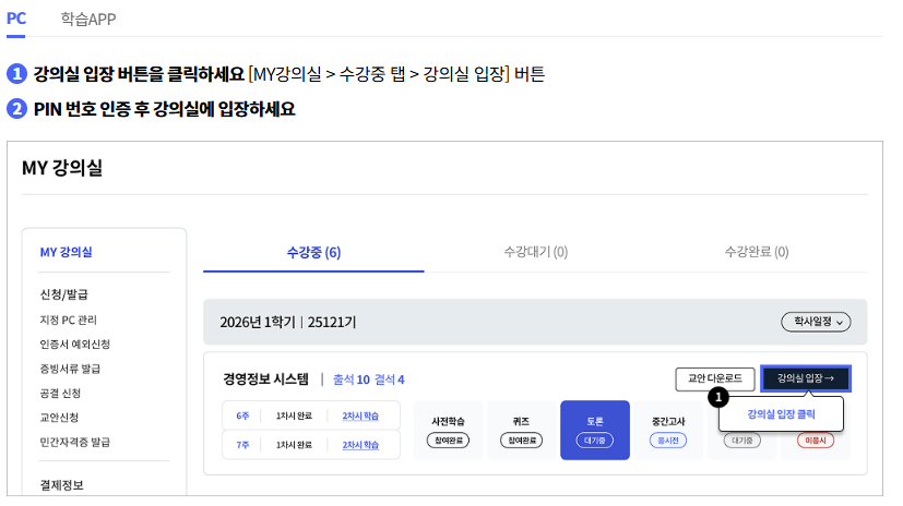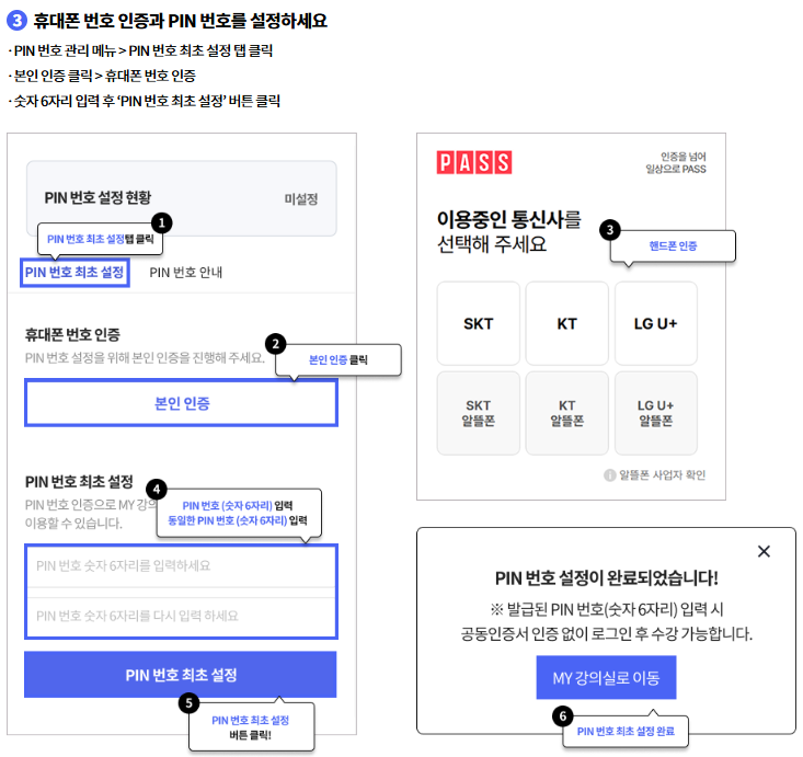 ▼ PIN번호 인증이란? - 간단한 6자리 비밀번호 입력만으로 강의실 입장이 가능합니다. - 최초 1회 설정 후 계속적으로 이용 가능